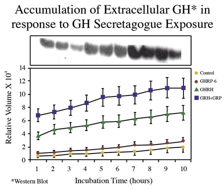 Having this information about GHRH/GHRP synergy from in vivo studies, we repeated the earlier in vitro studies, for the purpose of characterizing and differentiating the responses of primary cell cultures from rat pituitary glands to both GH secretagogues. Pituitary glands were collected from three month old Sprague Dawley rats, minced and enzymatically digested. The dispersed cells were plated, incubated for 24 hours after which time the primary cell cultures were washed with buffer and exposed to 10-10M sermorelin (GHRH), GHRP-6 or GHRH + GHRP-6 for hourly increments up to a maximum of 10 hours. GHRP-6 was readily available at the time and was used in lieu of GHRP-2 since their mechanisms are exactly the same. The GHRP’s differ only in potency. Controls were handled exactly the same as treated groups except that GH secretagogues were not added to the cell cultures. In these studies, intracellular and extracellular GH concentrations were estimated by Western blot analysis while GH messenger RNA (mRNA) was measured by Northern blot analysis.